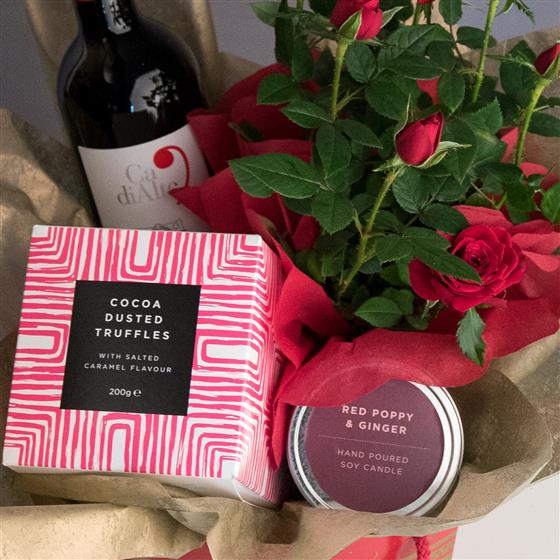 Featuring a beautiful red rose plant, Salted caramel truffles (the tastiest chocolates ever!) A red poppy and ginger candle, and a bottle of red to finish. All presented in a festive gift bag with tissue paper.