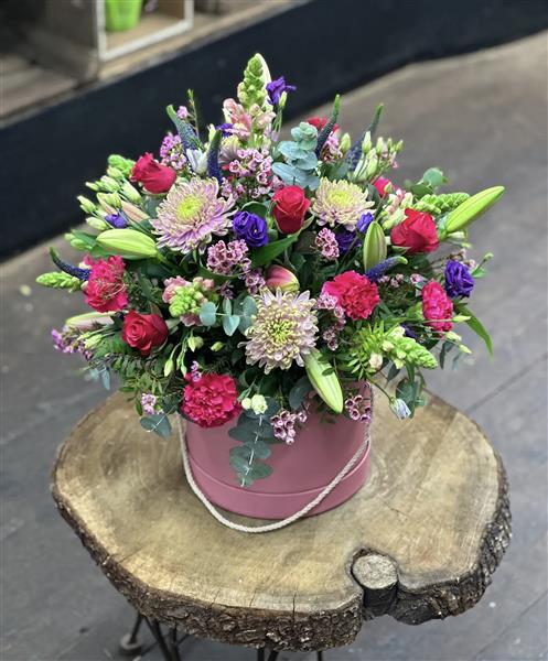 Our florists will select the best flowers to suit your chosen colour scheme and create a bespoke arrangement in floral foam designed in a hatbox, complete with a hand written message in one of our complimentary gift cards on your behalf, all of this will done here at our shop in Wallingford