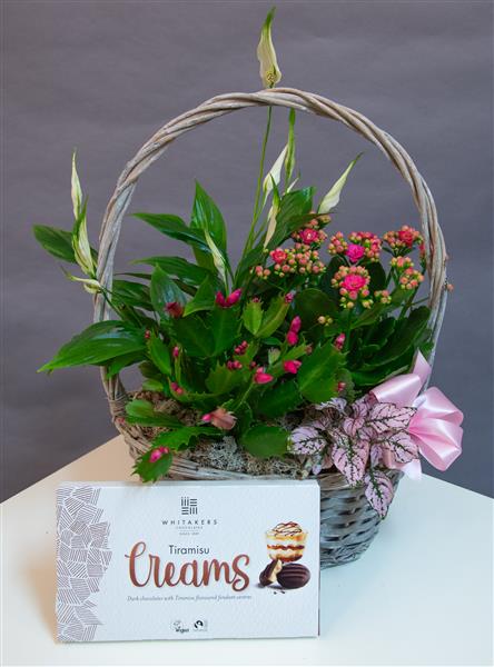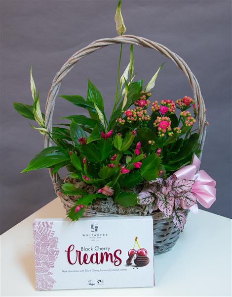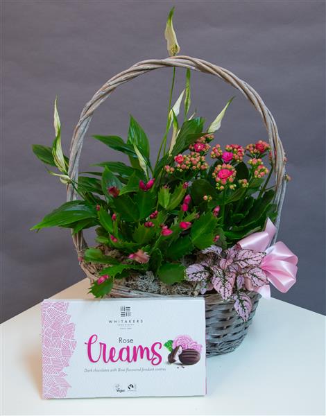 Our indoor planter is made using seasonal plants in beautiful shades of pink and whites, Lovingly arranged in a grey oval basket with handle. The perfect seasonal gift for Mother's Day.