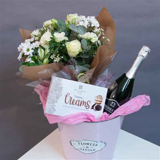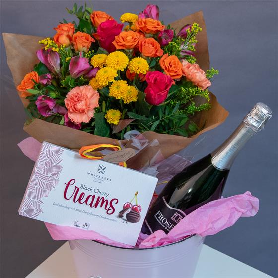 In your hamper you will receive, a beautiful florist choice mixed bouquet in your colour selection. A bottle of your choice of fizz or vino and a box of our new Whitaker chocolates. All of this will be lovingly presented in a large keepsake tin with tissue paper.