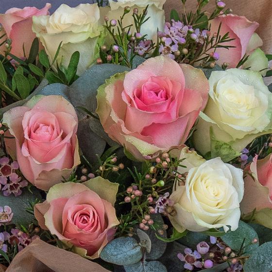 NEW to this year, our mixed rose hand ties have proven a popular choice, so we have designed a pretty pastel version especially for Mother's Day! Featuring a mix of pale pink and white roses, sweet scented pink wax flower and foliages.