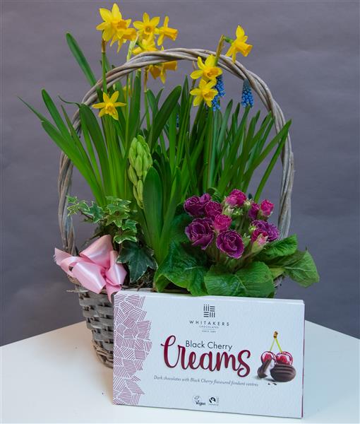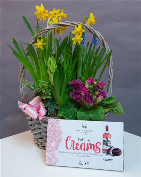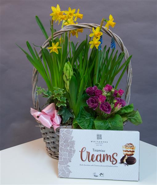 Our spring planter is made using seasonal spring plants in those vibrant colours, Lovingly arranged in a grey oval basket with handle. The perfect seasonal gift for Mother's Day.