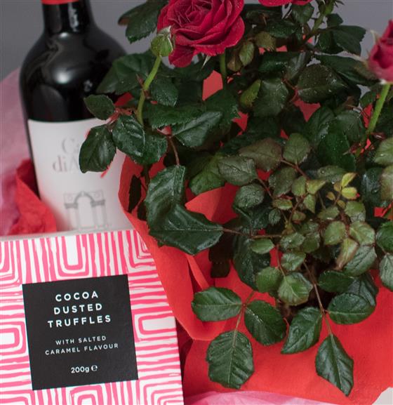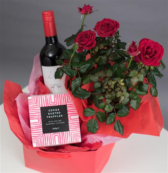 NEW gift set alert! This year we have included our planted gift set into our online collection. The valentines plant gift set includes a beautiful red rose plant, which can be enjoyed for years to come. Along side the rose plant, you also get a bottle of red wine and a box of the really yummy cocoa dusted truffle chocolates. Your gift is presented in a red keepsake bag with tissue paper.